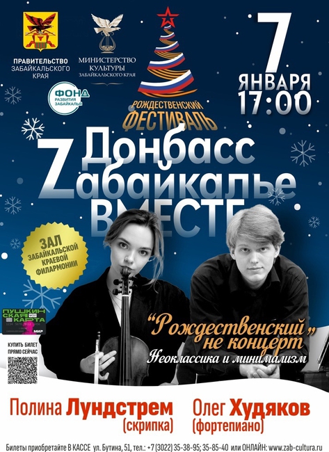 7 января в 17:00 в рамках рождественского фестиваля «Донбасс и Zабайкалье. Вместе» в камерном зале Забайкальской краевой филармонии Лауреат всероссийских и международных конкурсов Полина Лундстрем (скрипка) и Лауреат многих международных конкурсов Олег Худяков (фортепиано) представят специально подготовленную для фестиваля программу «Рождественский не концерт: неоклассика и минимализм».