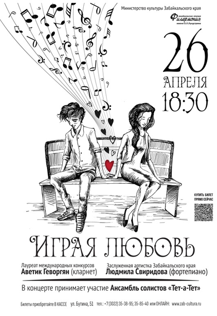 26 апреля в 18:30 в камерном зале Забайкальской краевой филармонии премьерную концертную программу «Играя любовь» представят артисты филармонии Лауреат Международных конкурсов Аветик Геворгян (кларнет) и Заслуженная артистка Забайкальского края Людмила Свиридова (рояль).