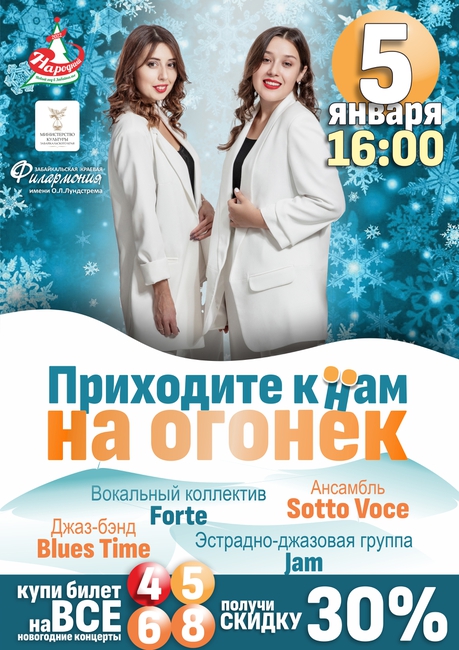 5 января в 16:00 программу «Приходите к нам на огонек» представят артисты вокального коллектива «Forte», ансамбля «Sotto Voce», джаз-бэнда «BluesTime» и эстрадно-джазовй группы «Jam» .
