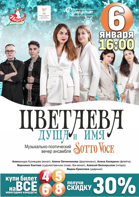 6 января в 16:00 ансамбль «Sotto Voce» представит праздничную программу, посвященный творчеству поэтессы Серебряного века - «Цветаева. Душа и имя».