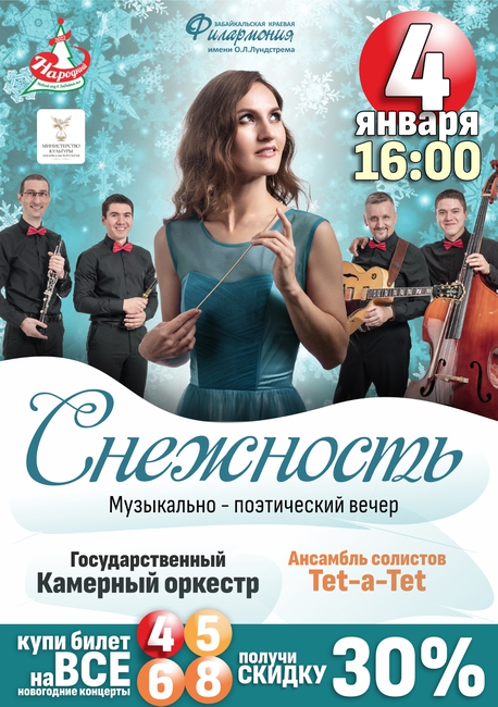 4 января в 16:00 в камерном зале ждет музыкально – поэтический вечер «Снежность» в исполнении Государственного камерного оркестра и ансамбля солистов «Тет – А – Тет».