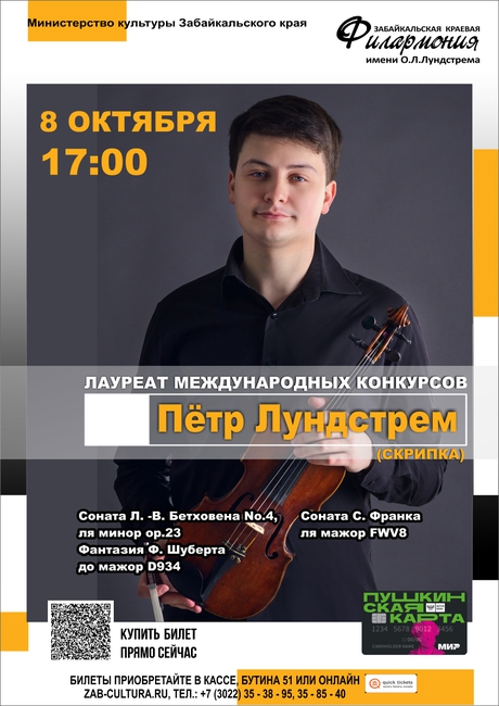 8 октября в 17:00 грандиозное событие на сцене большого концертного зала филармонии. Концертную программу представит Лауреат Международных конкурсов Пётр Лундстрем (скрипка).