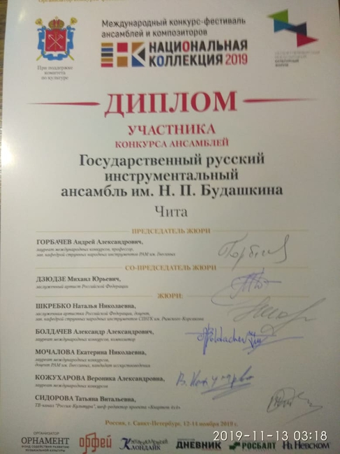 12 ноября Государственный русский инструментальный ансамбль им. Н.П. Будашкина принял участие во втором туре Международного конкурса-фестиваля ансамблей и композиторов «Национальная коллекция 2019», проходящем в городе Санкт-Петербург.