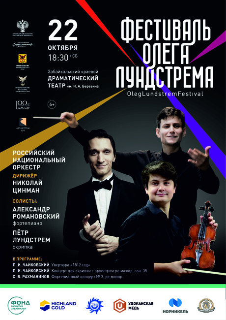 22 октября в 18:30 в рамках фестиваля Олега Лундстрема на сцене Забайкальского краевого драматического театра им. Николая Березина состоится большой концерт самого титулованного и известного оркестра России – Российского национального оркестра и солистов Александра Романовского и Петра Лундстрема. Дирижёр – Николай Цинман.