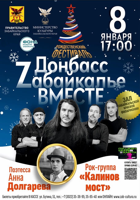 8 января в 17:00 на сцене большого концертного зала Забайкальской филармонии российская рок-группа Калинов Мост, творчество которой сочетает рок-музыку с влияниями русских народных песен и славянской мифологии, а также Российская поэтесса Анна Долгарева представят зрителям специально подготовленную для фестиваля программу.
