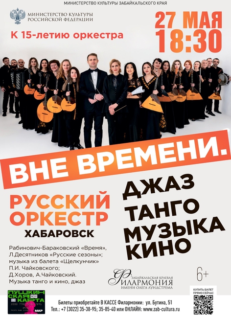 Концертная программа к 15-летию оркестра русских народных инструментов «РУССКИЙ ОРКЕСТР» - «Вне времени. Джаз. Танго. Музыка кино» - это уникальный сплав музыкальных жанров, объединенных одной идеей, виртуозным исполнением и оригинальными аранжировками.