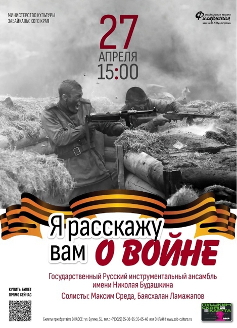 В преддверии 77-летней годовщины Победы в Великой Отечественной войне солисты филармонии Максим Среда и Баясхалан Ламажапов представят совместную программу с Государственным ансамблем имени Николая Будашкина «Я расскажу вам о войне…».