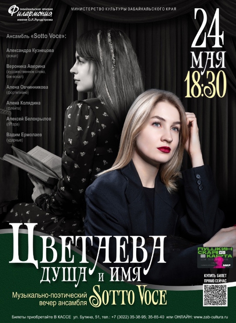 24 мая в 18:30 в органном зале филармонии ансамбль «Sotto Voce» расскажет о Марине Цветаевой, чья биография неразрывно связана с историей страны тех лет.