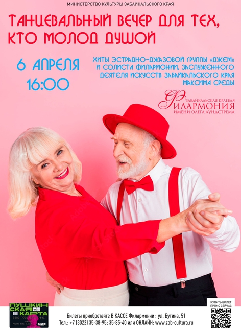 6 апреля в 16:00 в Забайкальской филармонии пройдет танцевальный вечер «Для тех, кто молод душой». Для гостей филармонии концертные номера представят солисты и лучшие коллективы Забайкальской филармонии.