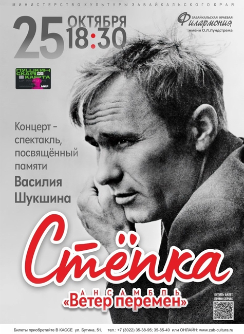 25 октября в 18:30 в органном зале филармонии состоится театрализованный концерт «Степка» в исполнении ансамбля «Ветер перемен», посвященный памяти Василия Шукшина.