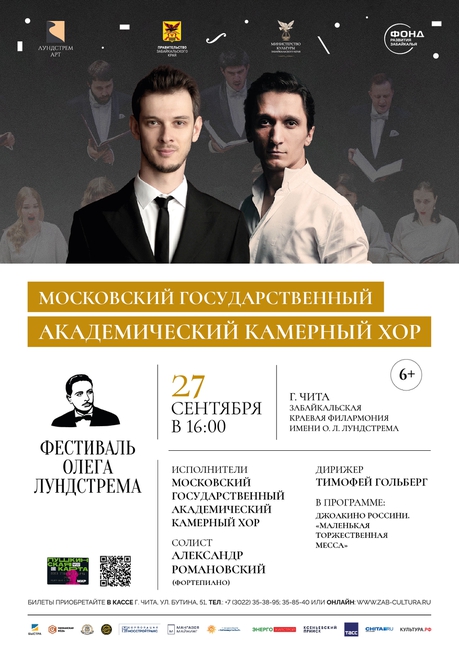 27 сентября в 16:00 на сцене большого концертного зала филармонии концертную программу в рамках IV Фестиваля Олега Лундстрема представит Московский государственный академический камерный хор (дирижер, Тимофей Гольберг) и солист Александр Романовский (фортепиано).