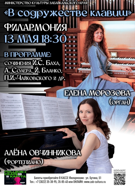 13 мая в 18:30 в органном зале Забайкальской краевой филармонии состоится концерт «В содружестве клавиш». В программе примут участие солистки филармонии — Елена Морозова (орган) и Алёна Овчинникова (фортепиано).