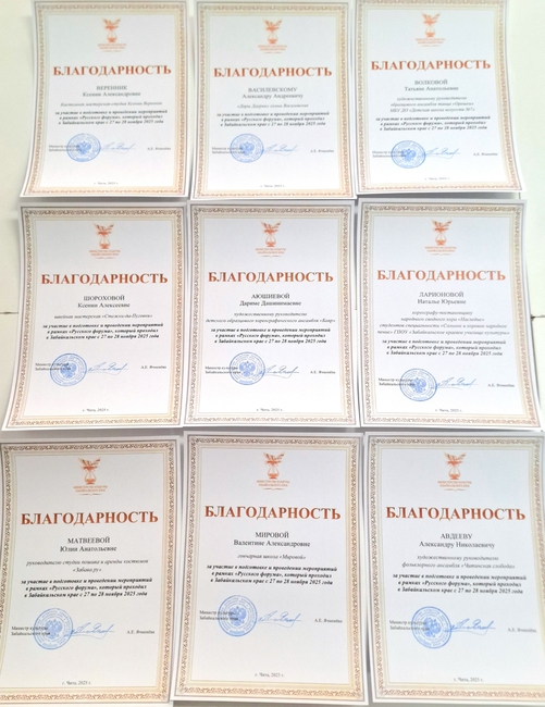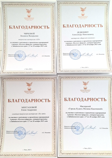 Забайкальская краевая филармония и Министерство культуры Забайкальского края от всей души благодарят творческие коллективы, мастеров и руководителей, принявших участие в подготовке и проведении мероприятий в рамках «Русского форума», который проходил в Забайкальском крае с 27 по 28 ноября 2025 года.
