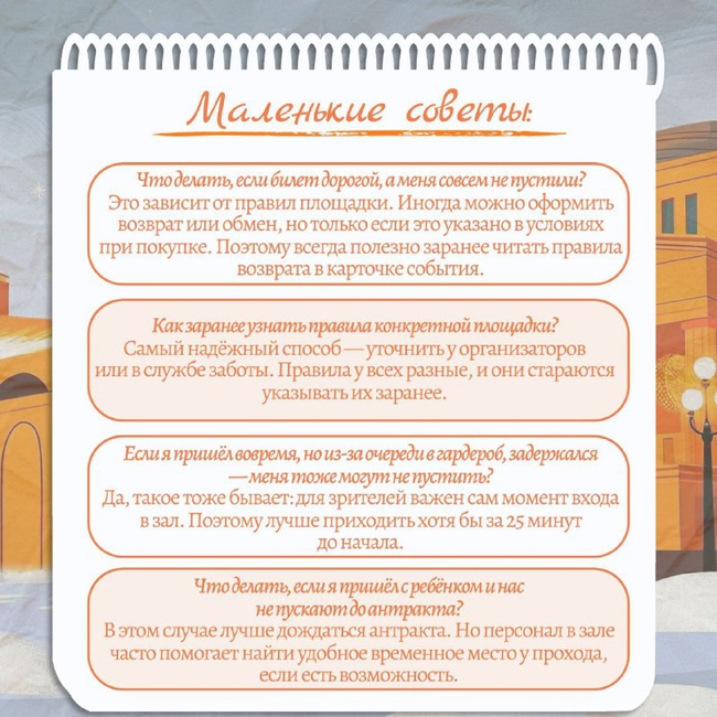 ✓ Если идёте с ребёнком — лучше дождаться паузы, чем пробираться через ряд во время тихой сцены, а телефон лучше перевести в беззвучный режим заранее.