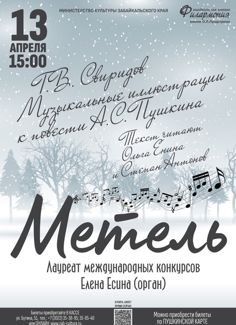 Театрализованное представление в исполнении главного режиссера Степана Антонова и музыковеда Ольги Ениной будет ярко дополнено музыкальными иллюстрациями из одноименной сюиты Георгия Свиридова. Невероятно красивые мелодии, едва уловимый перезвон бубенцов, романсовые интонации, нежнейшие напевы, истинно русская музыка – все это прозвучит в совершенно новом, органном прочтении Елены Есиной.